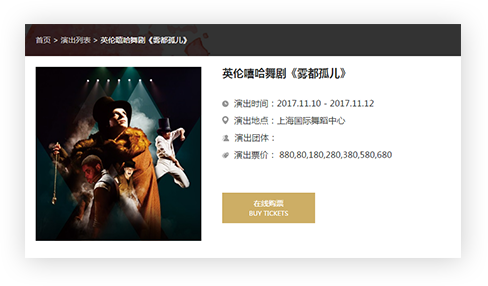 演出詳情頁面調用實時購票信息數據,使瀏覽者可在線進行演出查詢、在線選座、購票一站式操作,大大提升用戶查詢購票體驗。