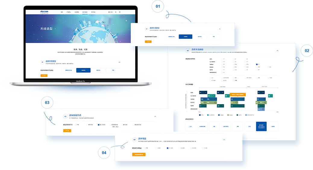 定制開發天線選型功能,幫助瀏覽者通過簡單四個步驟快速縮小天線選擇范圍,從而快速找到符合需求的產品。