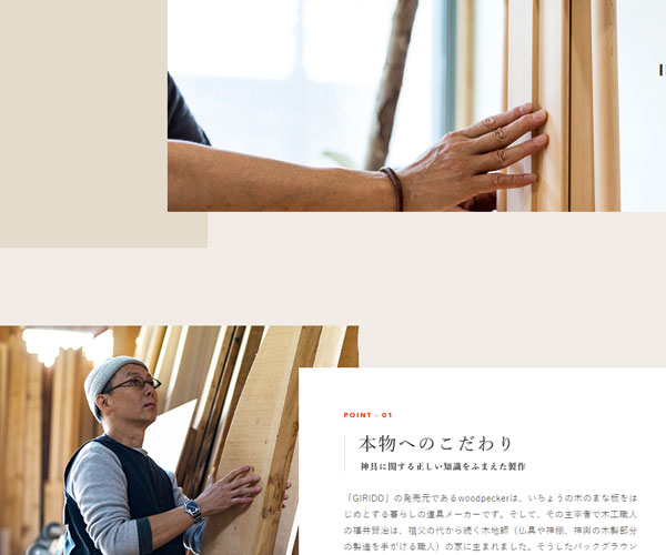 Woodpecker以木制神龕的制作為主,頁面的設(shè)計整體顏色偏暖,木頭的顏色與產(chǎn)品圖