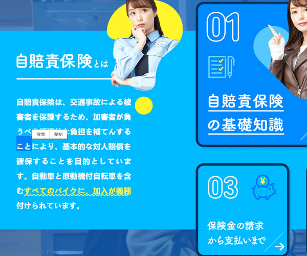 Jibaisekihoken是一家為大眾做交通意外險的公司,網站的設計風格活潑可愛,